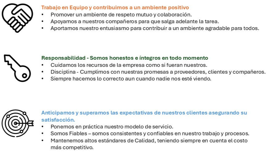 Nuestros Valores guían e inspiran nuestras acciones e interacciones y se espera que todos los colaboradores actúen con respeto e integridad promoviendo el trabajo en equipo, y cumpliendo a cabalidad sus funciones diarias para continuar siendo una empresa exitosa, asegurarnos 45 años más.